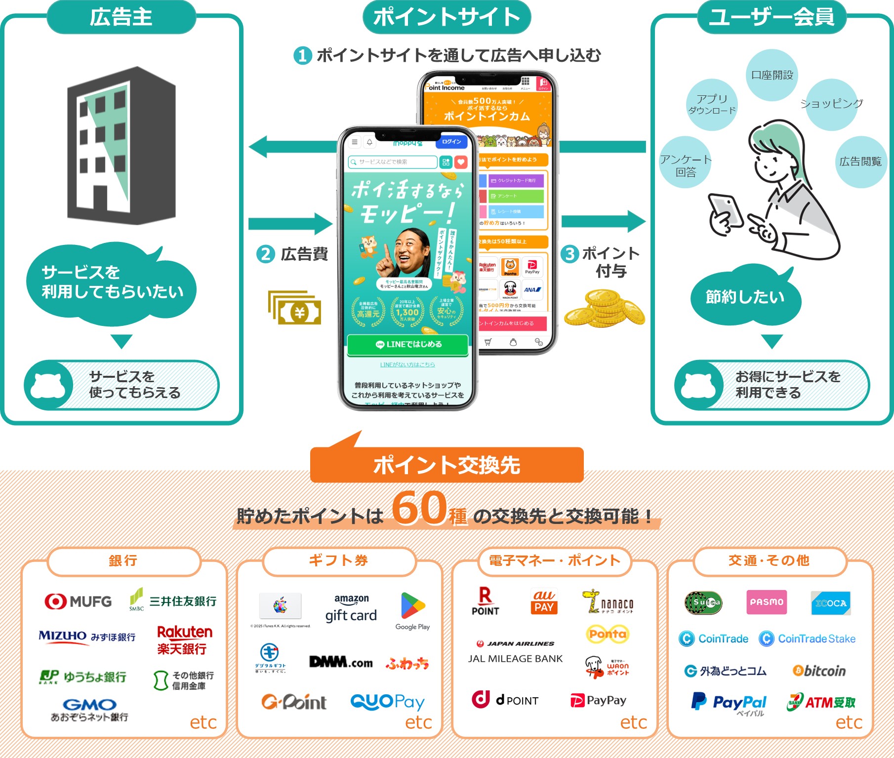 「モッピー」は、累計1,400万人以上の方にご利用いただいている国内最大級のポイントサイトです。モッピーでは、ショッピングやコンテンツ登録、アンケート回答、広告の閲覧などを通じ、ポイントを貯めることができます。貯まったポイントは、「1ポイント=1円」で現金や各種電子マネー、ギフトコード、共通ポイント、ビットコインなど約60種類のサービスに交換可能です。