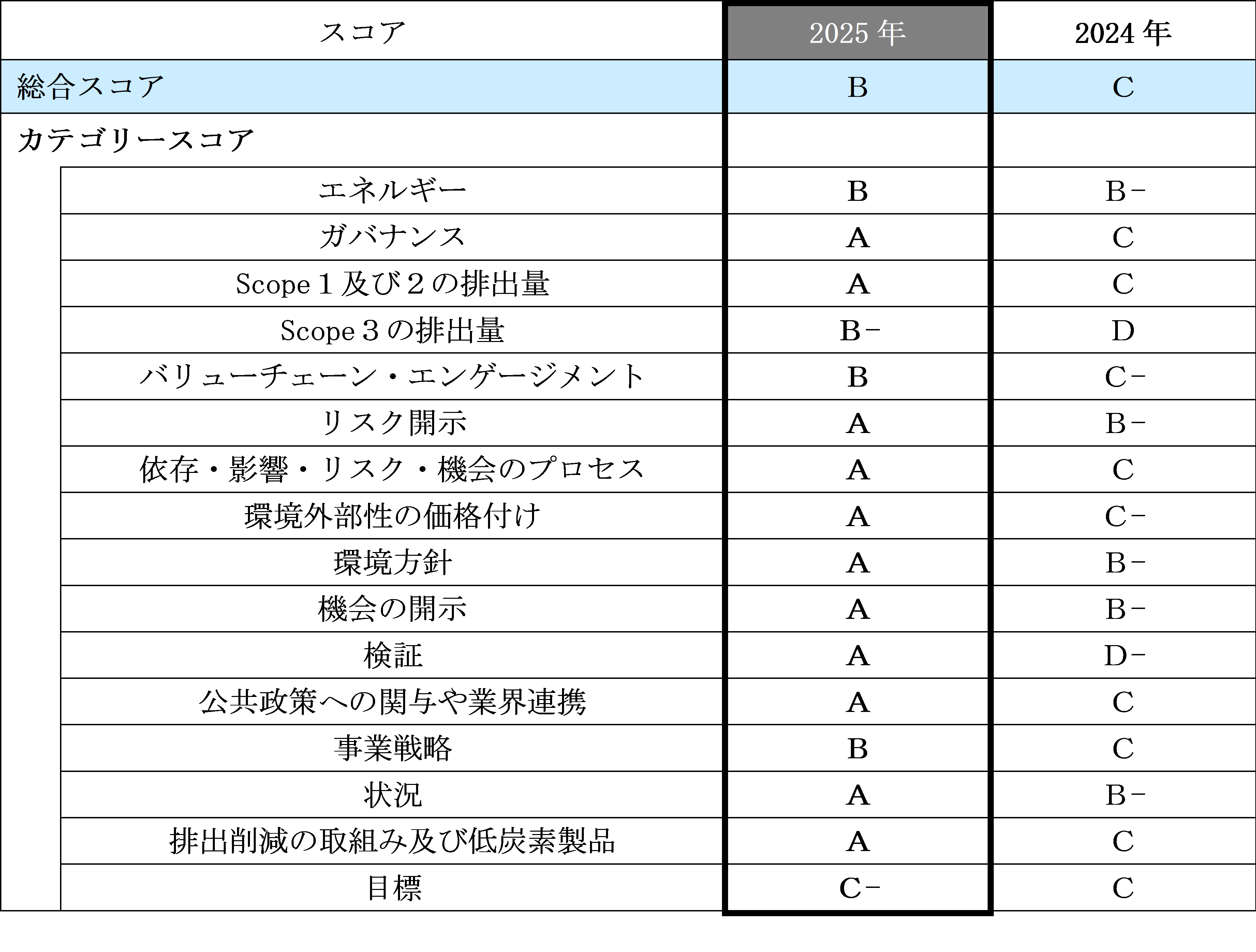 当社のCDPスコアは、2025年度気候変動分野において昨年の「C」から2段階スコアアップし、「B」を獲得しました。「B」は「マネジメントレベル」とされ、企業が気候変動に関するリスクと機会を認識し、それらに対して具体的な行動を起こしている状態を示します。スコアの詳細は、下記をご確認ください。